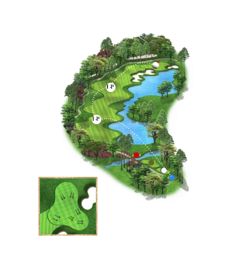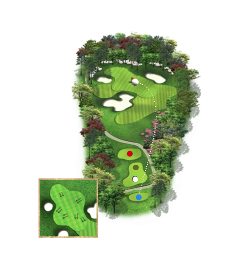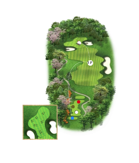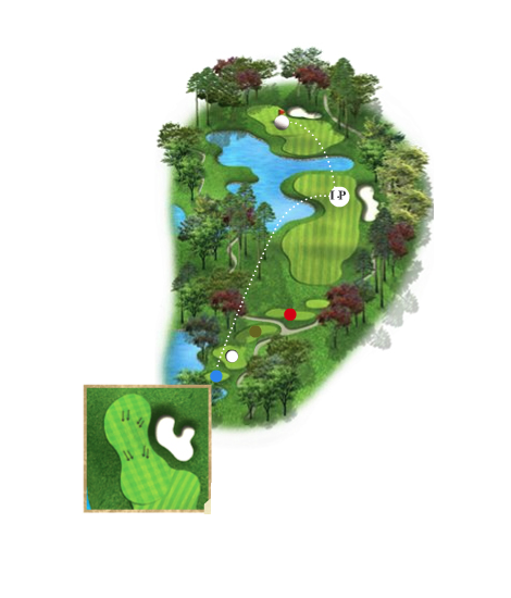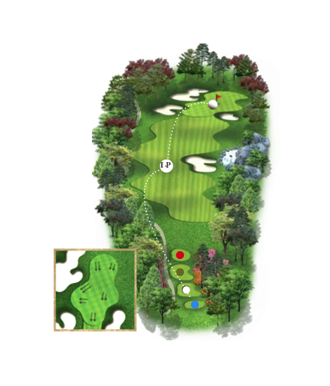 우측 벙커를 넘기면 투온도 가능하고 버디를 노려볼 만한 홀이다. 그러나 무리한 세컨샷은 그림 앞 연못과 좌측의 벙커에 의해 어려움을 당할 수 있다.
