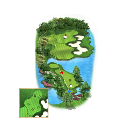 긴 파 3홀이다. 좌우측이 전부 연못으로 되어 있으며 그린 앞 대형 벙커는 위협적으로 도사리고 있다.