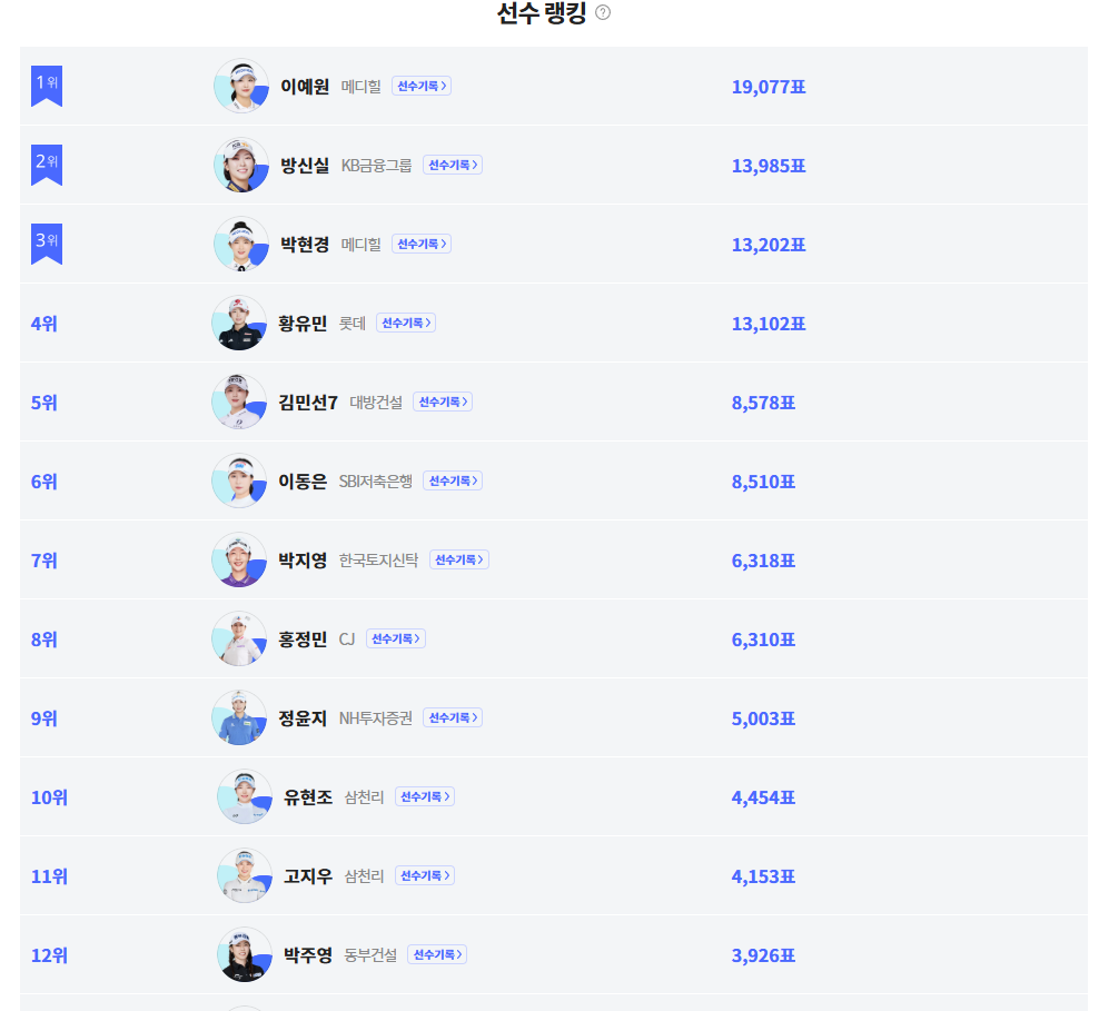 현재 1위를 달리고 있는 선수는 '이예원', 그 뒤를 이은 방신실, 박현경, 황유민,김민선7 등 루키와 베테랑이 혼전 양상을 보이고 있습니다. 팬들의 관심이 뜨거운 만큼 순위 변동도 자주 일어나고 있죠.