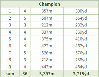Champion Course티샷 렌딩 지점이 좁아 드라이버 샷의 정확도가 요구되며 그린이 앞뒤로 긴 관계로핀의 위치에 따라 공략이 달라져야 한다. 티샷은 우측보다 좌측 언덕 쪽을 향해 치는 것이 안전하다.