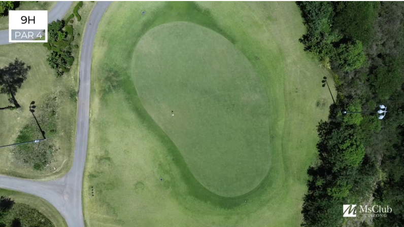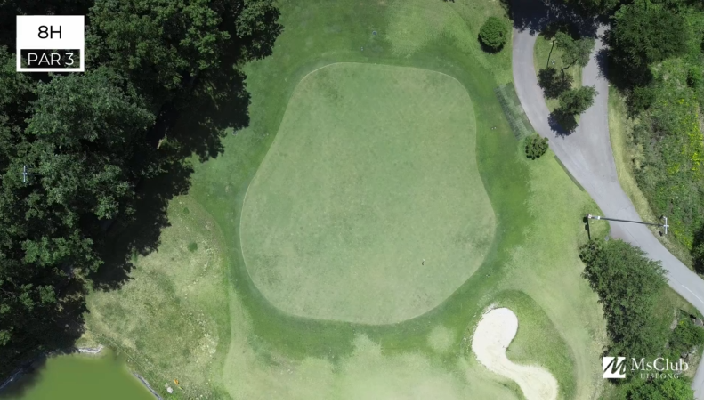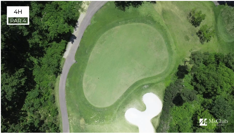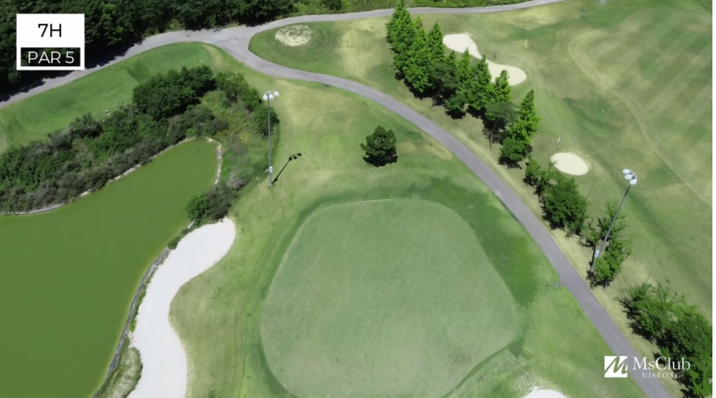 Champion Course내리막 홀로써 장타는 투온도 가능하다. 하지만 안전하게 서드 온으로 버디를 노릴 수 있다.티샷이 왼쪽으로 가면 해저드에 빠질 확률이 높기 때문에 장타가 아닌 안전하게 서드 온 작전으로 가는것이 좋다.