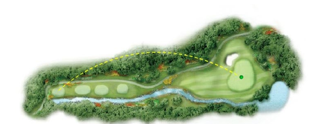 티잉그라운드는 우측으로 졸졸 흐르는 실개천과 함께 높은 언덕에 위치해 있으며 최소한의 페어웨이만을 기자고 있기 때문에 넓게 펼쳐진 그린에 가깝게 공략하지 않으면 마운드에서의 어프로치를 피할 수는 없다.